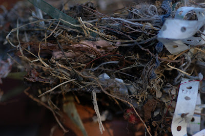 The nest is constructed the way I dream of nests with twigs, some mud, a single stem of redwood tree. But it's also made with street trash, a gum wrapper, straw wrapper, a bit of plastic and the cottony butt of a cigarette. There are three colors of printer paper edgings laced and sewn with twist ties, threads, yarns and a mysterious amount of string.